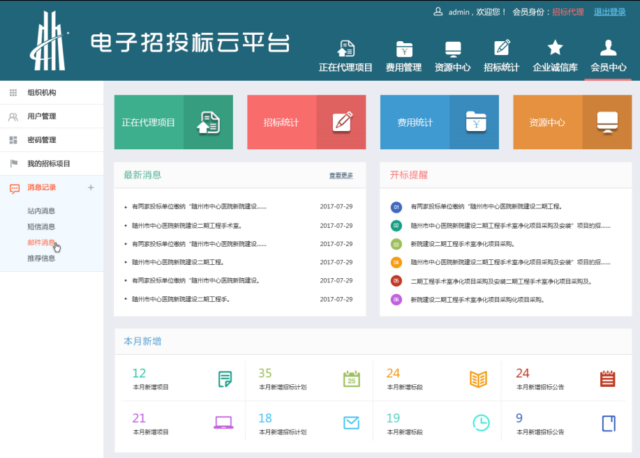 5、门户站点:对外提供招投标公告资讯等相关信息;